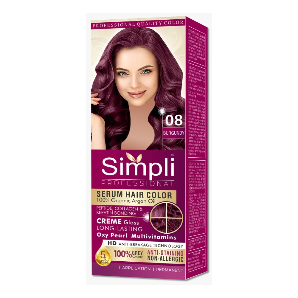 Achieve bold, glossy, and vibrant burgundy hair with Simpli Serum Hair Color 08 Burgundy, combining professional coloring and nourishment in one formula.